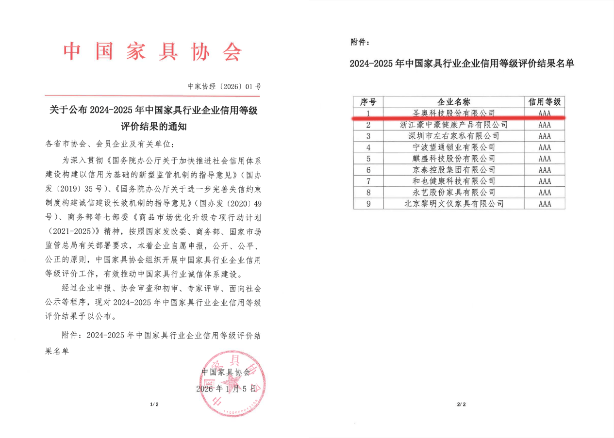 开云2026年1月5日,中国家具协会官网公布了2024-2025年度中国家具行业企业信用等级评价结果,圣奥科技股份有限公司等11家企业获评最高信用等级“AAA”。